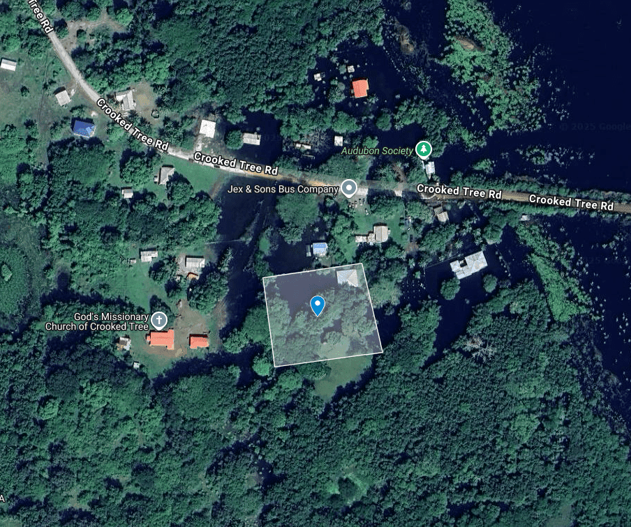 Own a rare 1.725-acre homesite/investment parcel in the heart of Crooked Tree Village—paired with a solid, elevated 3 – bedroom house (50 ft x 50 ft = 2,500 sq ft) that jump-starts your build, business, or eco-retreat plans. That’s ~75,141 sq ft (≈6,981 m²) of usable space, with all utility services available to the site.
